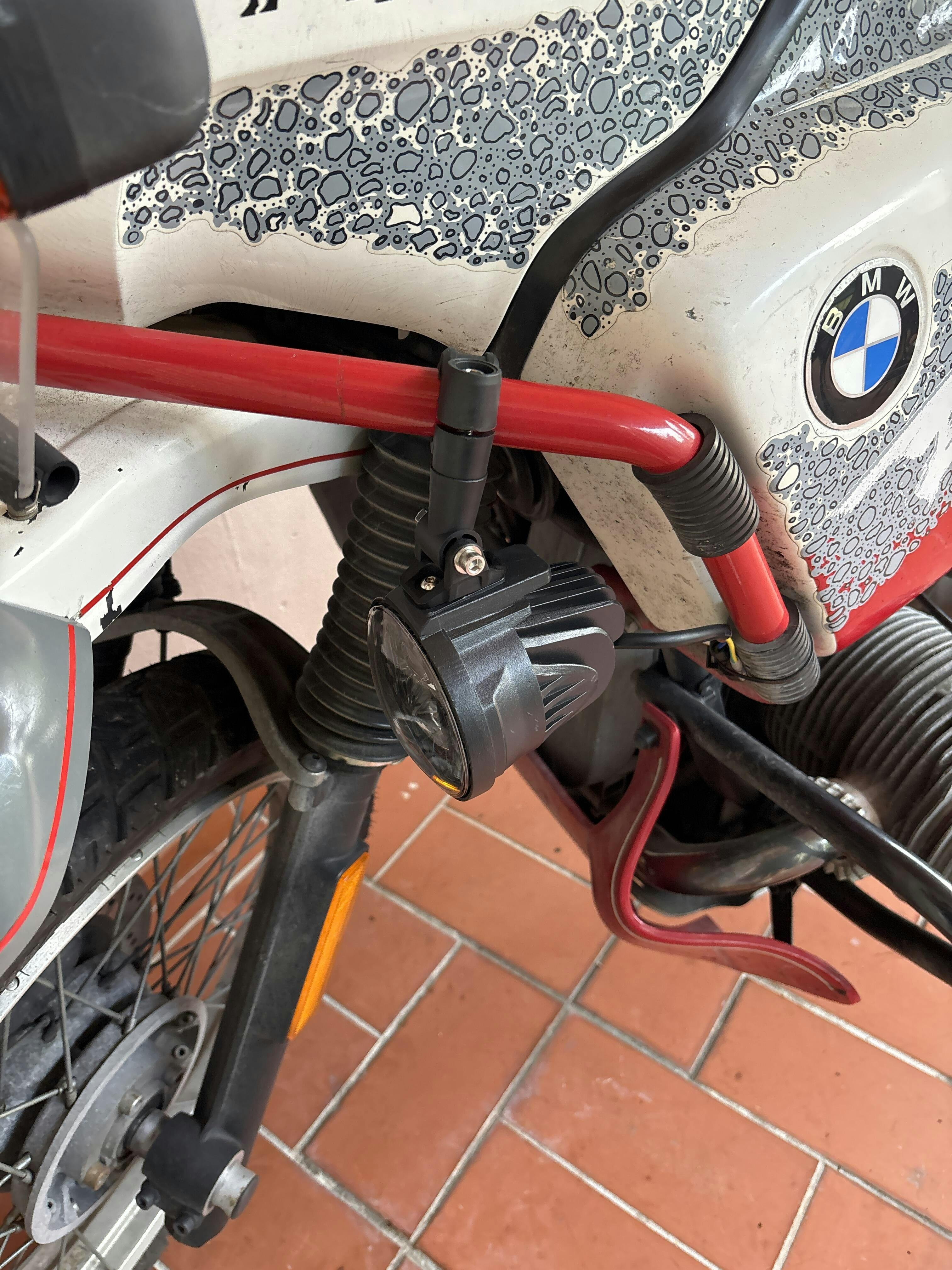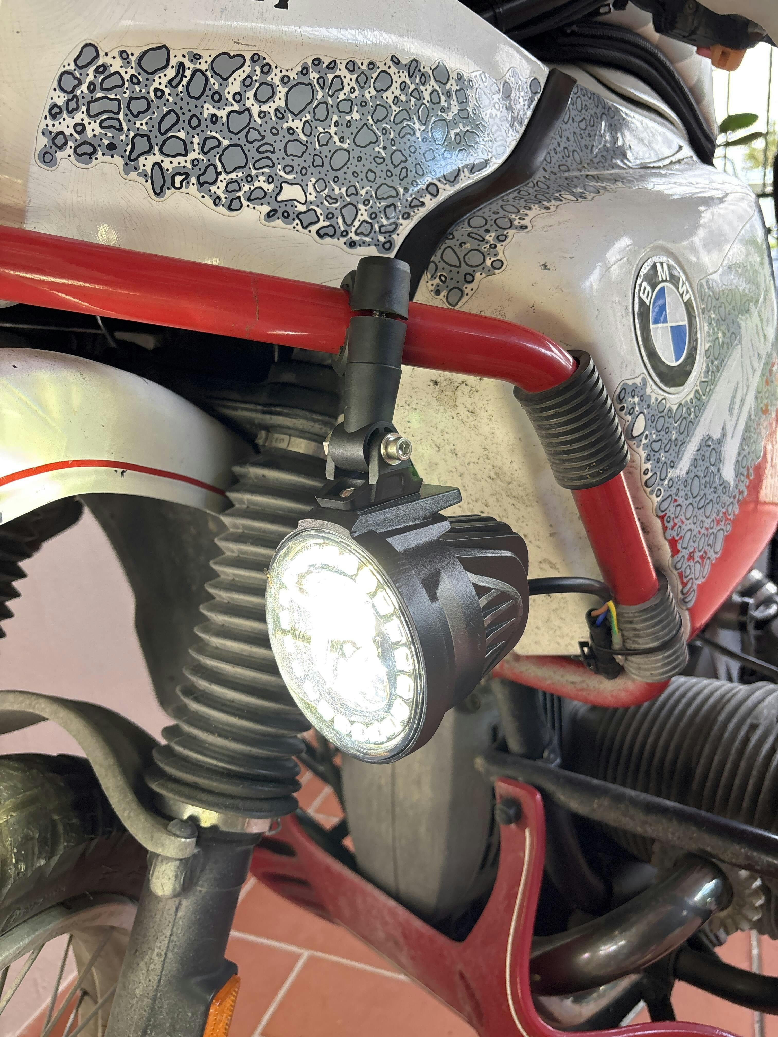 I installed this on a 1993 BMW R100GSPD right on the side fearing protection cage. At first I was not thrilled with the integrated clamping system that comes with the light pods. But I quickly realize this is great design capable of attaching to just about any size tube, at any partial angle or orientation just the way it comes. No need to buy anything else. Great quality harness in the box was a nice touch for the prize. The only complaint I have is that the outer ring independent control is via a short pigtail that will require additional wiring and a possible switch. It does come on when you use the included harness, but if you want to light the wing alone, you have to add wiring and a power source to this third wire coming out of each pod. But pricewise is hard to ask for more. Good work!